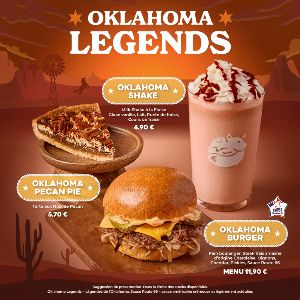 - Le Oklahoma Burger, avec son pain boulanger, son steak frais smashé avec oignons, son cheddar et ses pickles et LA sauce Route 66